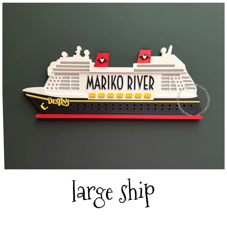 Inspired by cruise ships, set sail in style with this ship magnet for your cruise door. This is a 3D printed personalized ship with magnets flush on the back. Choose your favorite ship or get them all!
